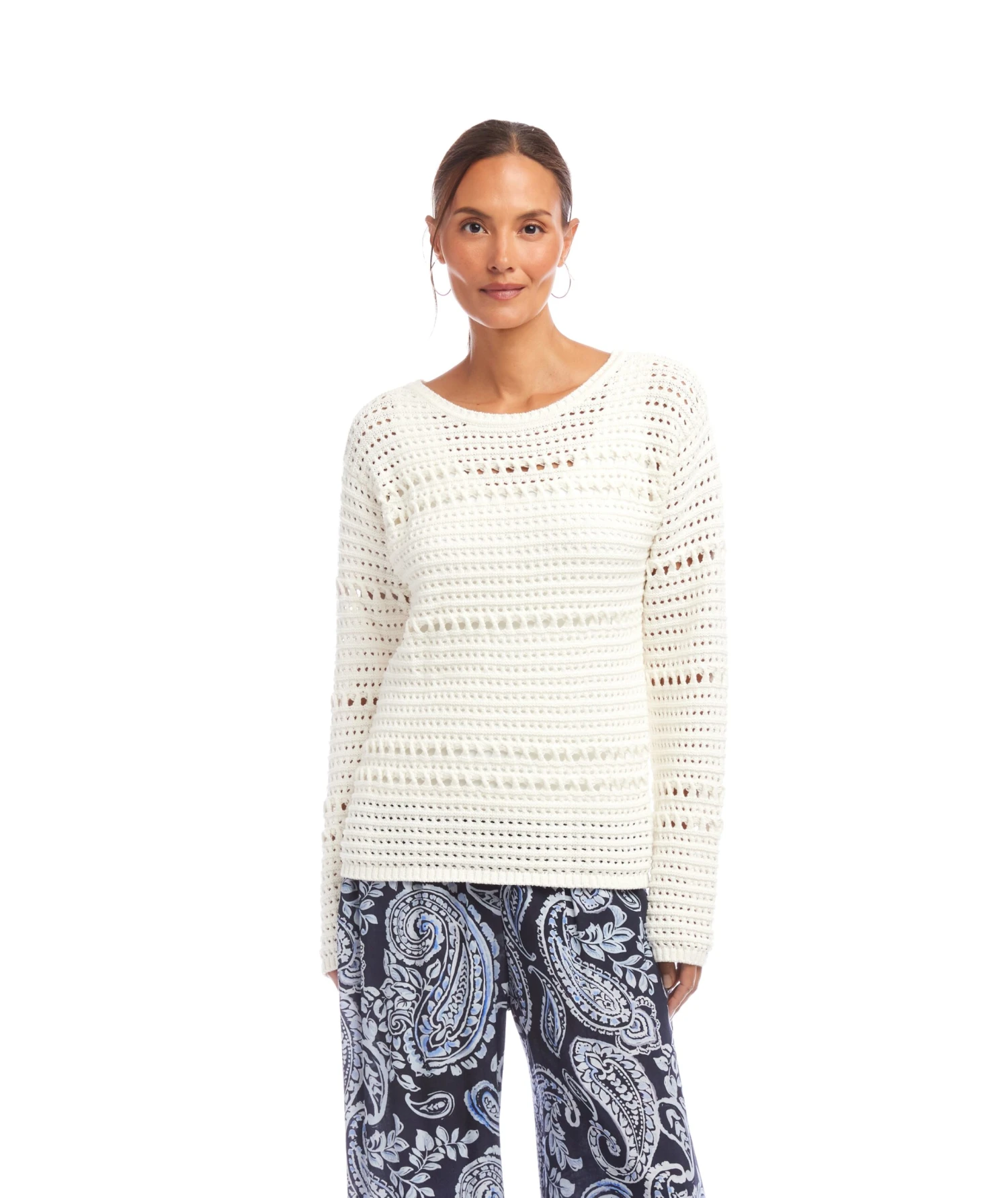 The boatneck crochet sweater is a stylish and airy knit top that combines a flattering neckline with intricate crochet detailing for a chic, textured look.