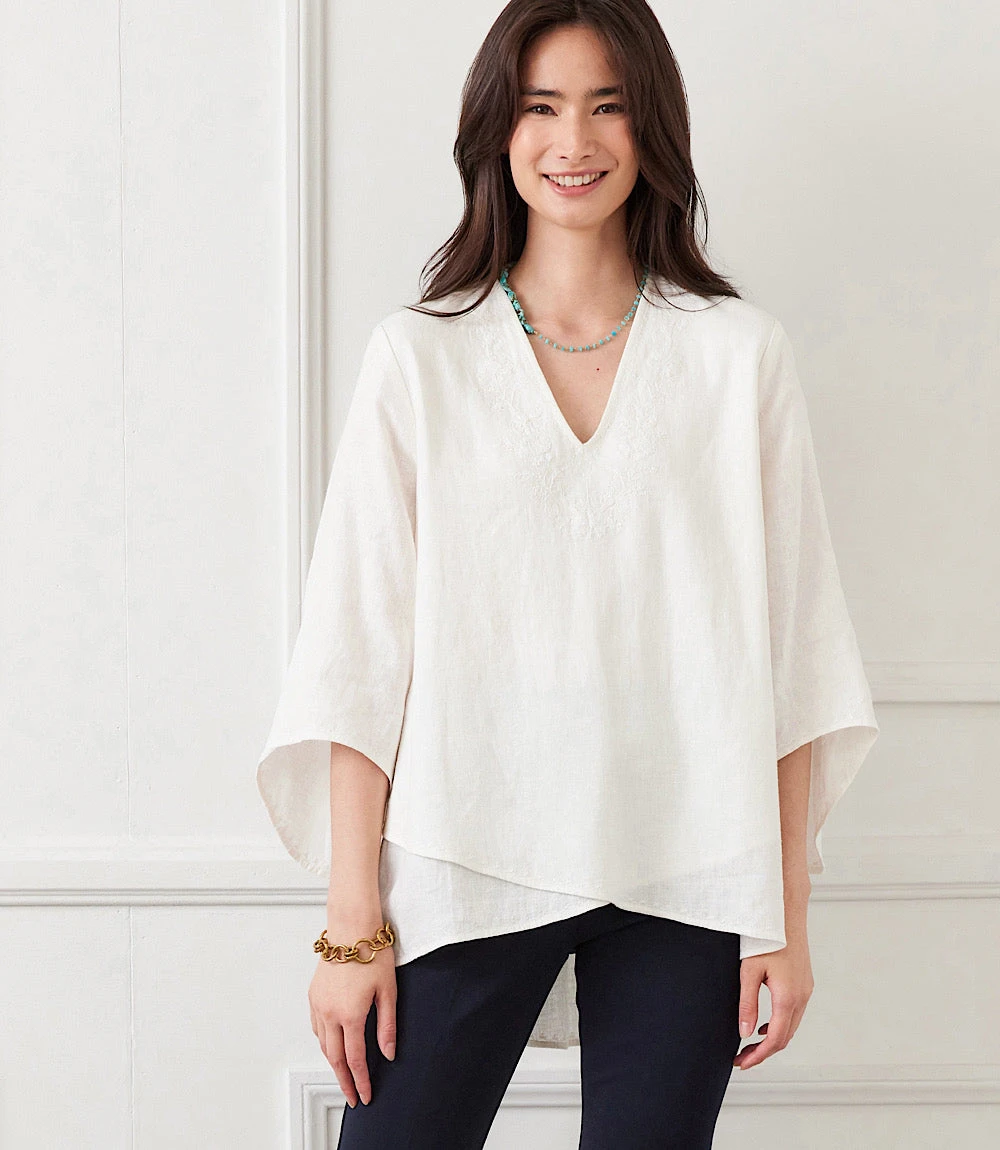 This Bracelet Sleeve Embroidered Asymmetric Top is crafted from a soft linen blend woven fabric and features a flattering V-neck, elegant bracelet sleeves, and a unique asymmetric hem. It is beautifully embroidered along the neck and sleeves for a feminine touch. Offered in cornflower blue and off-white, this versatile top is perfect for both casual and dressier occasions.