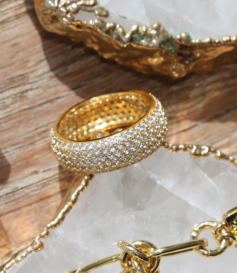 Add a touch of timeless sparkle with the Crystal Ring in gold. Crafted from 14K gold vermeil and embellished with rows of brilliant cubic zirconia, this band-style ring catches the light beautifully for an elegant, statement-making finish.