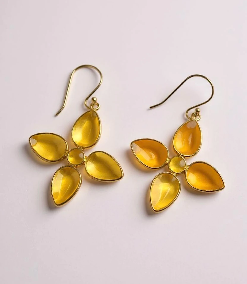 Delicate yet bold, these citrine-hued dangling earrings feature a floral-inspired design with four marquise-cut stones forming a graceful cross shape. The rich yellow sparkle adds a touch of elegance and charm to any outfit.