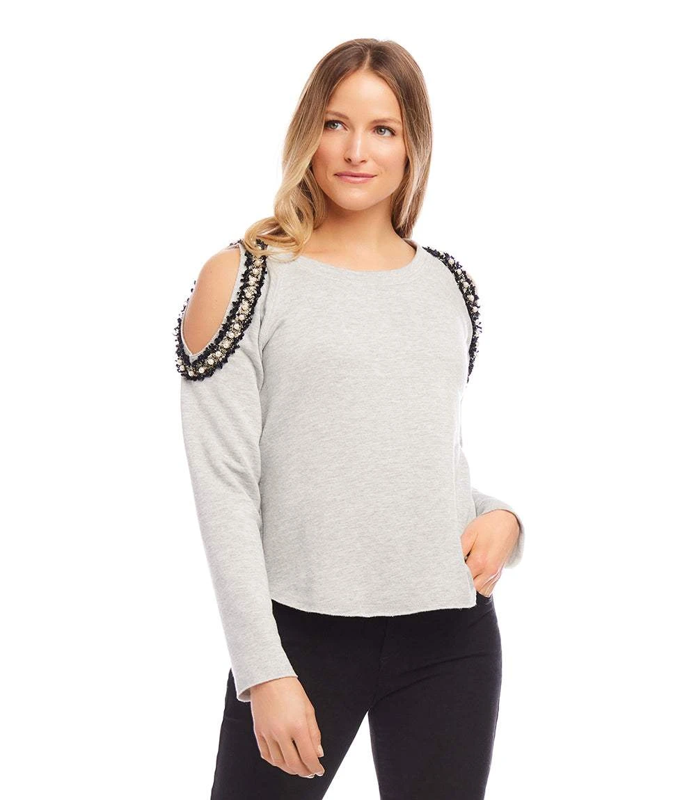 Expertly designed, this cold shoulder sweatshirt features intricate pearl embellishments that add a touch of elegance. Whether you’re running errands or heading out for a casual night, this sweatshirt is the perfect combination of comfort and style.