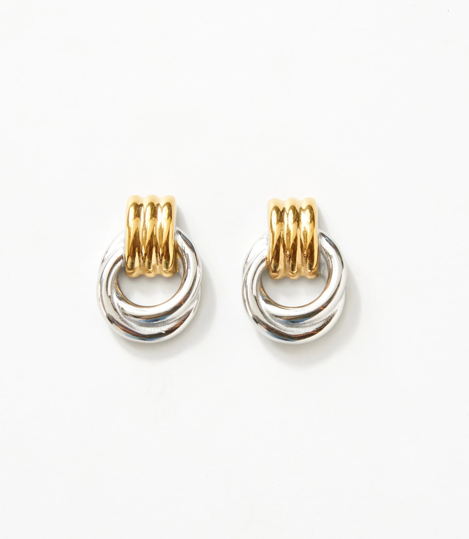 A modern twist on classic hoops. These two-tone earrings feature interlocking loops with polished gold plating over stainless steel, adding a sleek shine that catches the light beautifully. Lightweight yet statement-worthy, they’re perfect for elevating any look.