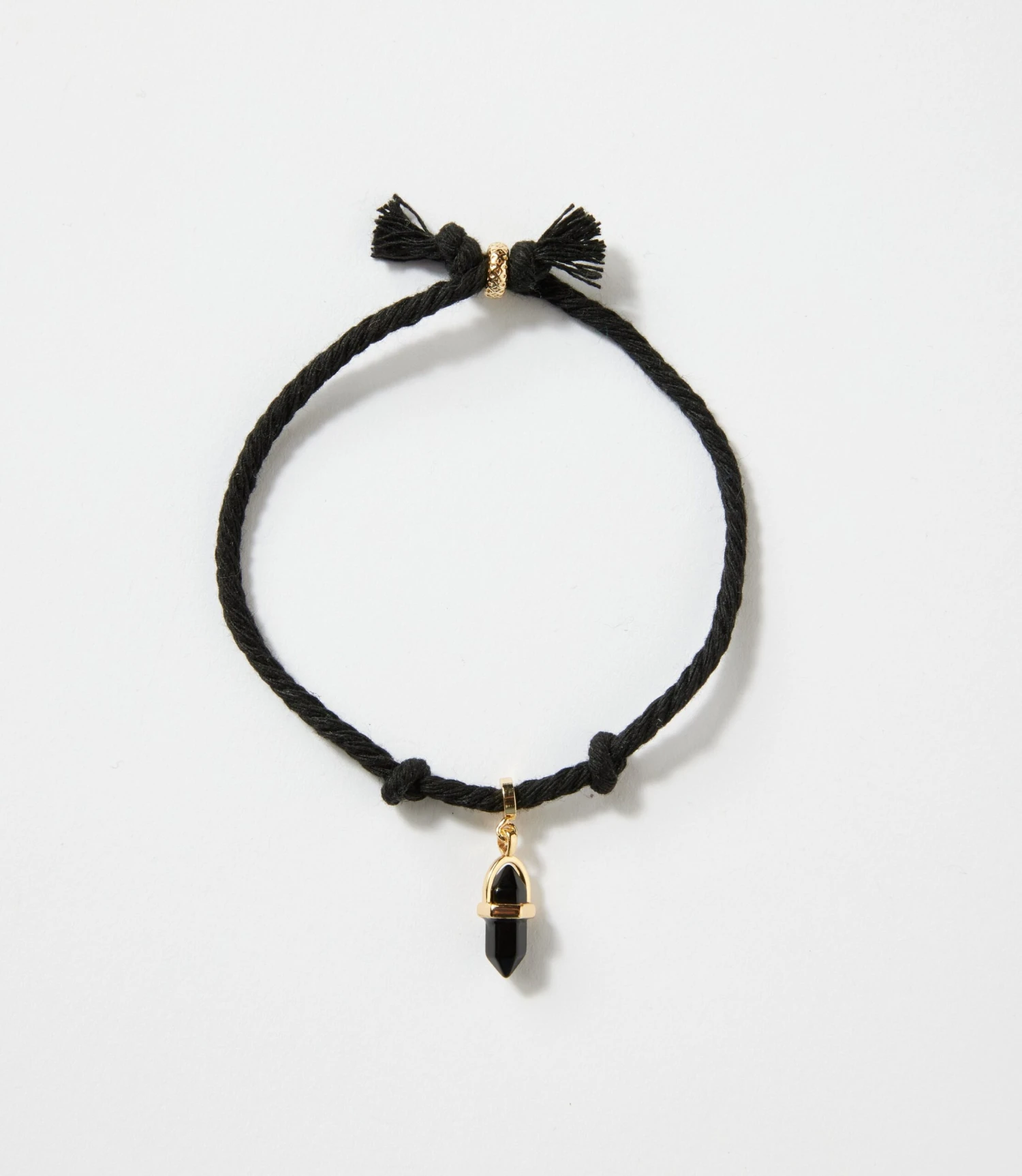 A sleek and minimal piece with a touch of edge. This bracelet features a polished black gemstone point set in gold-plated detail, strung on a soft cotton cord with an adjustable closure for a comfortable, customizable fit. Perfect for layering or wearing solo for effortless style.