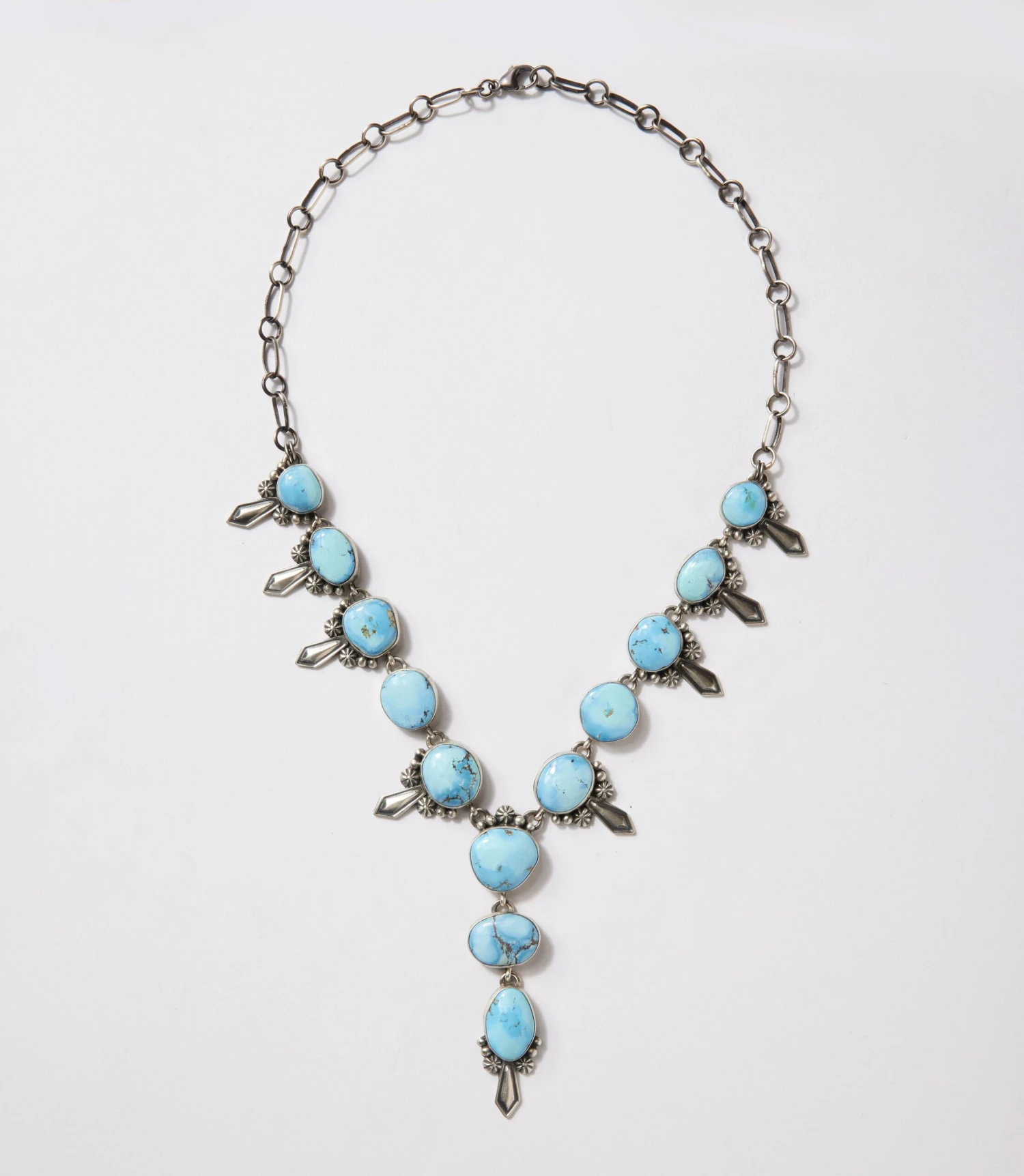 This striking lariat necklace features polished Golden Hill turquoise stones, each one showcasing soft sky-blue hues and natural patterns. Arranged in a cascading silhouette, the stones are framed in detailed metalwork and accented with geometric silver drops for added movement and dimension.