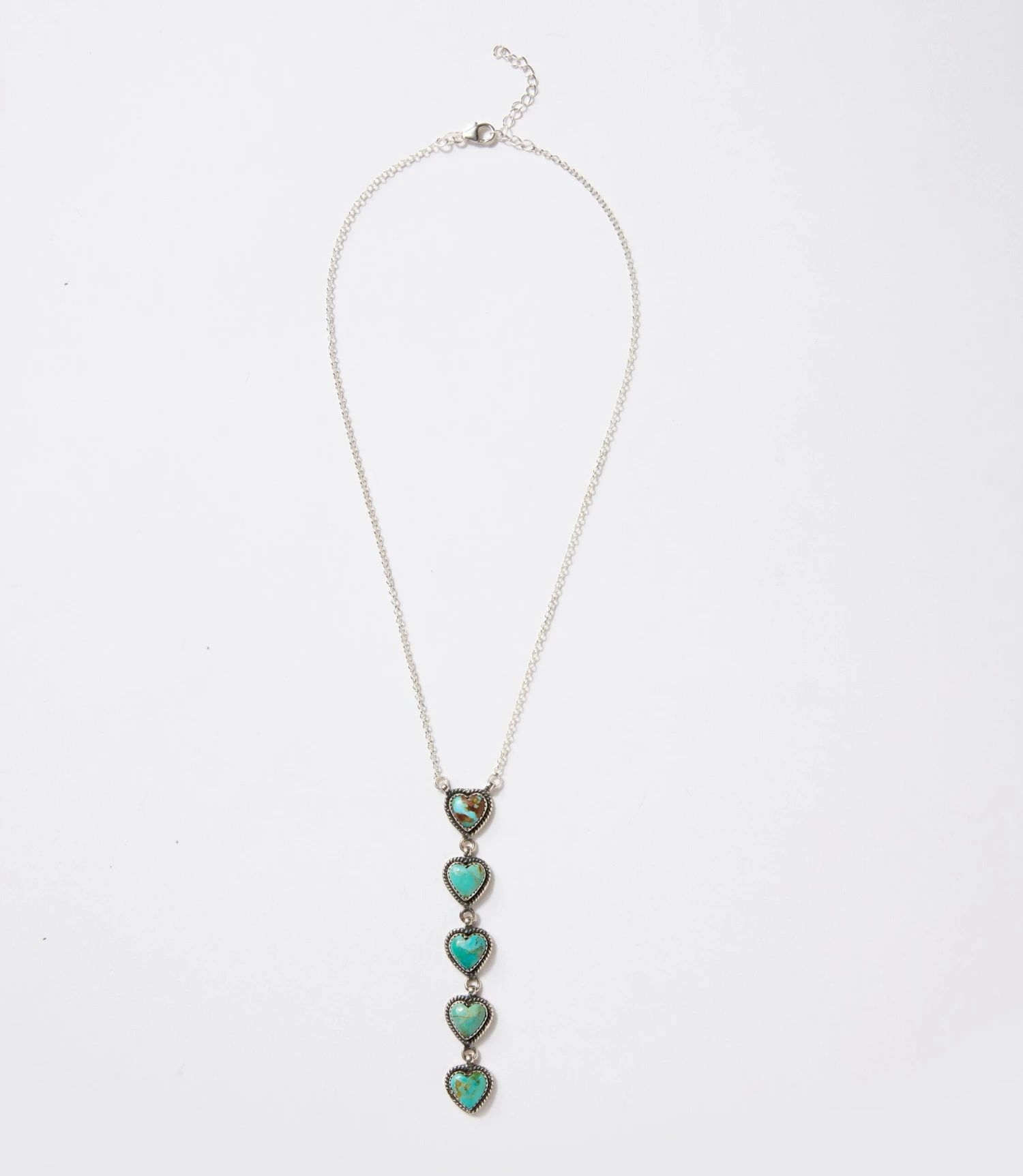 The Kingman Turquoise Heart Necklace features five heart-shaped turquoise stones arranged in a vertical drop for eye-catching movement. Framed with detailed silver-tone edging, each turquoise heart adds a pop of vibrant color and charm.