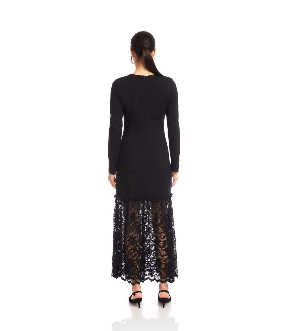 Elegant and refined, this long sleeve column dress is crafted from stretch Ponte fabric for a smooth, flattering fit. It features a sleek V-neckline and set-in sleeves for a clean, tailored silhouette. A delicate ruffle trim at the seam where the Ponte meets the lace adds a soft, feminine touch, while the dramatic contrast lace skirt brings texture and allure. Finished with a back zipper closure for easy wear.