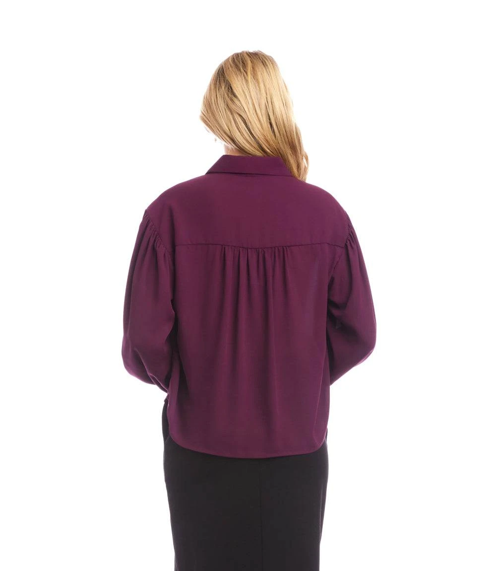 This long sleeve blouse is crafted from silky crepe for a smooth, lightweight feel with elegant drape. It features a classic collar, full button front with shell buttons, and softly gathered detailing at the front shoulders, sleeves, and buttoned cuffs. Dropped shoulders enhance the relaxed silhouette, while a shirttail hem and center back pleating add fluid movement and polish.