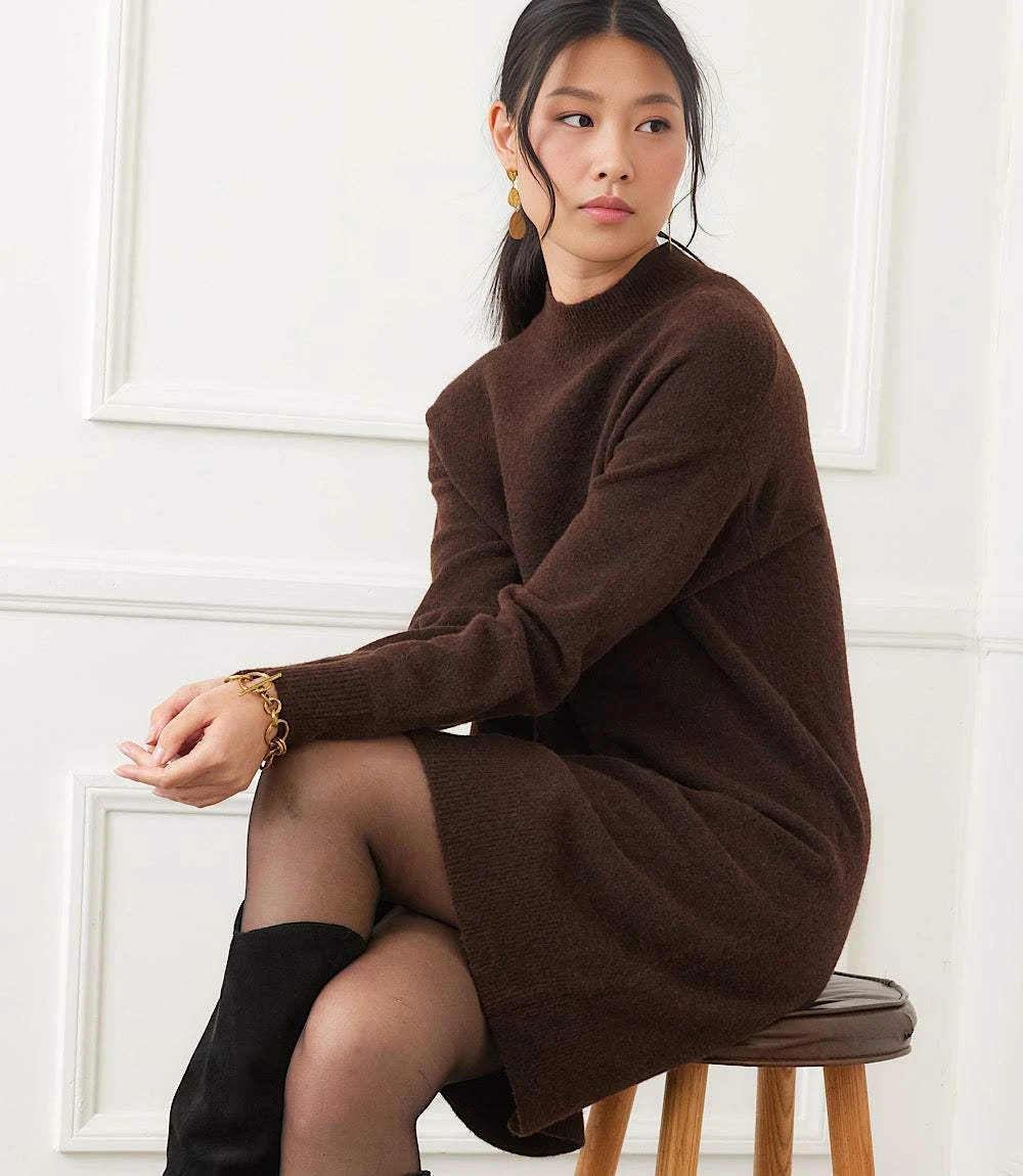 This mock neck sweater dress features long sleeves and soft ribbed edge detailing at the cuffs and hem for a refined finish. Made with a touch of wool for cozy warmth, it’s an effortlessly elegant piece that pairs perfectly with boots for a polished look.