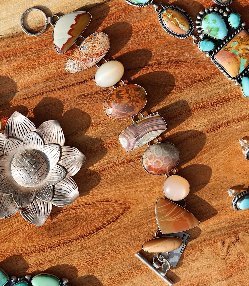 This Mosaic Natural Stone Link Bracelet showcases a variety of stones, thoughtfully arranged to create a distinctive mosaic effect—enhancing the bracelet’s unique and organic character. Each stone is set in a polished metal frame and connected by articulated links for flexible movement. At the back, interlocking circular links provide a smooth, comfortable fit. Finished with a toggle clasp for easy wear, it’s a striking piece that brings together natural textures and bold design.