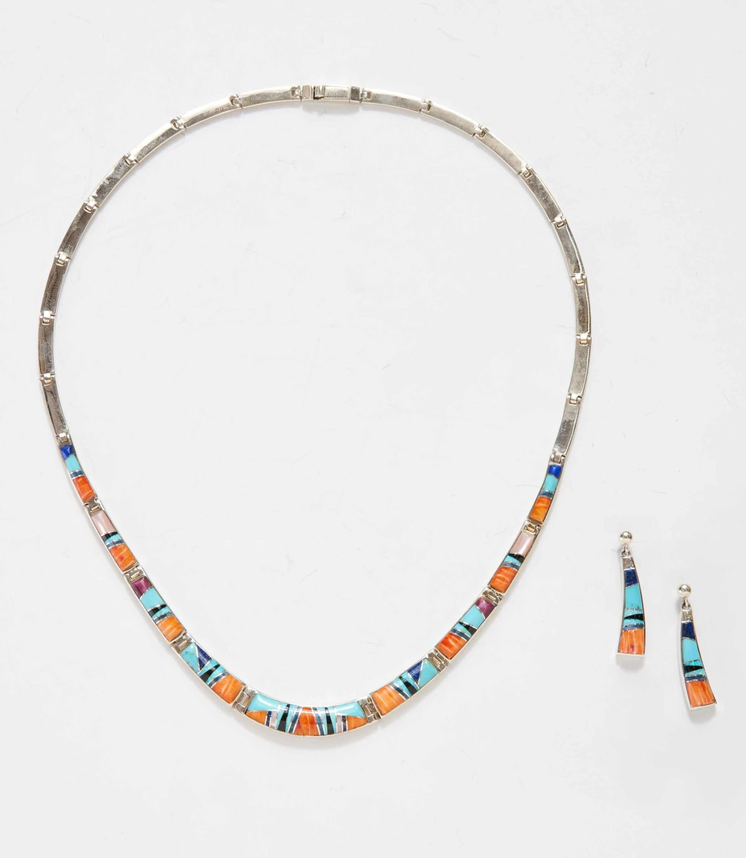Experience one-of-a-kind beauty with our Inlay Necklace and Earring Set. Handmade by Navajo artist Vee Joe, this set features a stunning mix of Multi Color Turquoise stones set in sterling silver. Elevate your style with this unique and expertly crafted accessory.