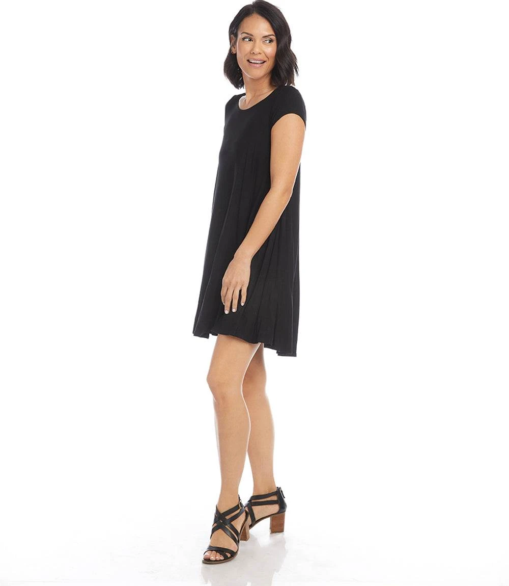 An effortless everyday essential, this dress features a scoop neck, cap sleeves, and a breezy trapeze silhouette that drapes beautifully. Crafted from soft, stretchy rayon spandex jersey, it’s finished with a soft high-low hem for subtle shape and movement.