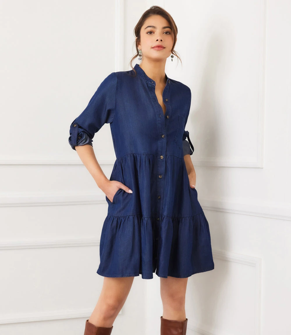 This tiered shirtdress features a classic button front, chest pocket, and roll-tab sleeves for versatile styling. The soft fabric and flared silhouette create a breezy, relaxed fit with a feminine finish.