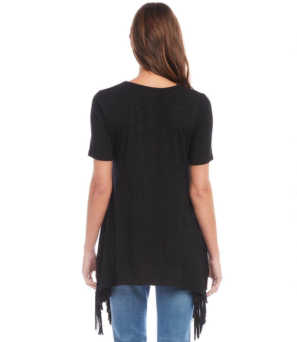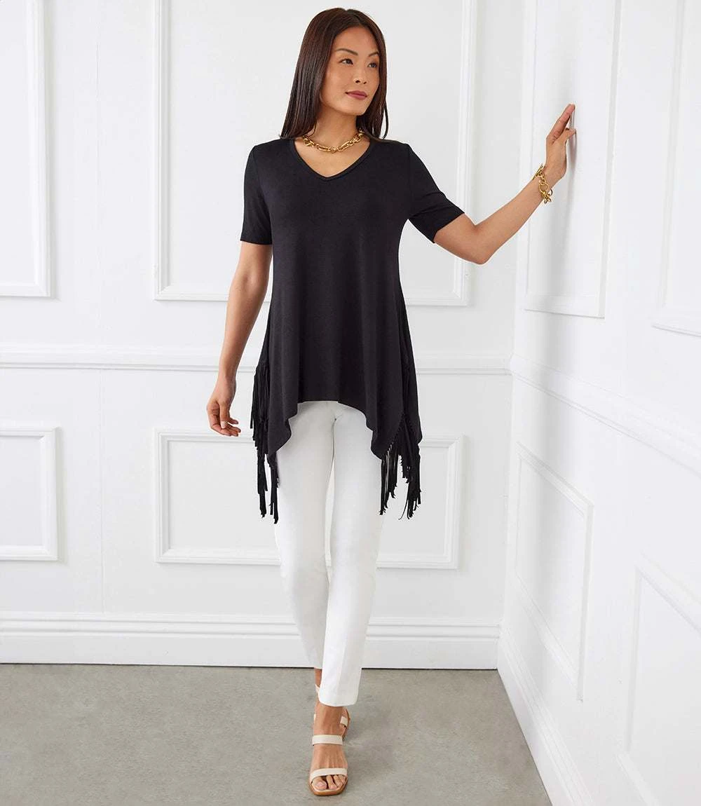 Stand out in style and comfort in this short-sleeved top with a classic v-neck design and a unique shark bite fringe hem for a contemporary twist.