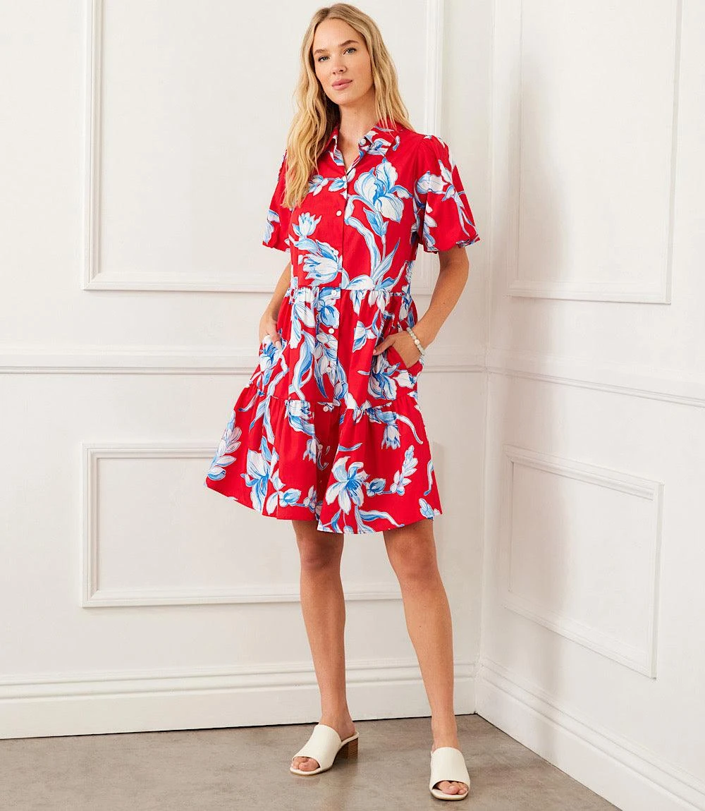 Crafted from an iris cotton poplin print featuring blue and white florals on a bold red background. Voluminous puff sleeves, a crisp collar, and a front button closure with delicate shell buttons add classic detail, while the softly gathered tiers and side pockets offer comfort and movement.