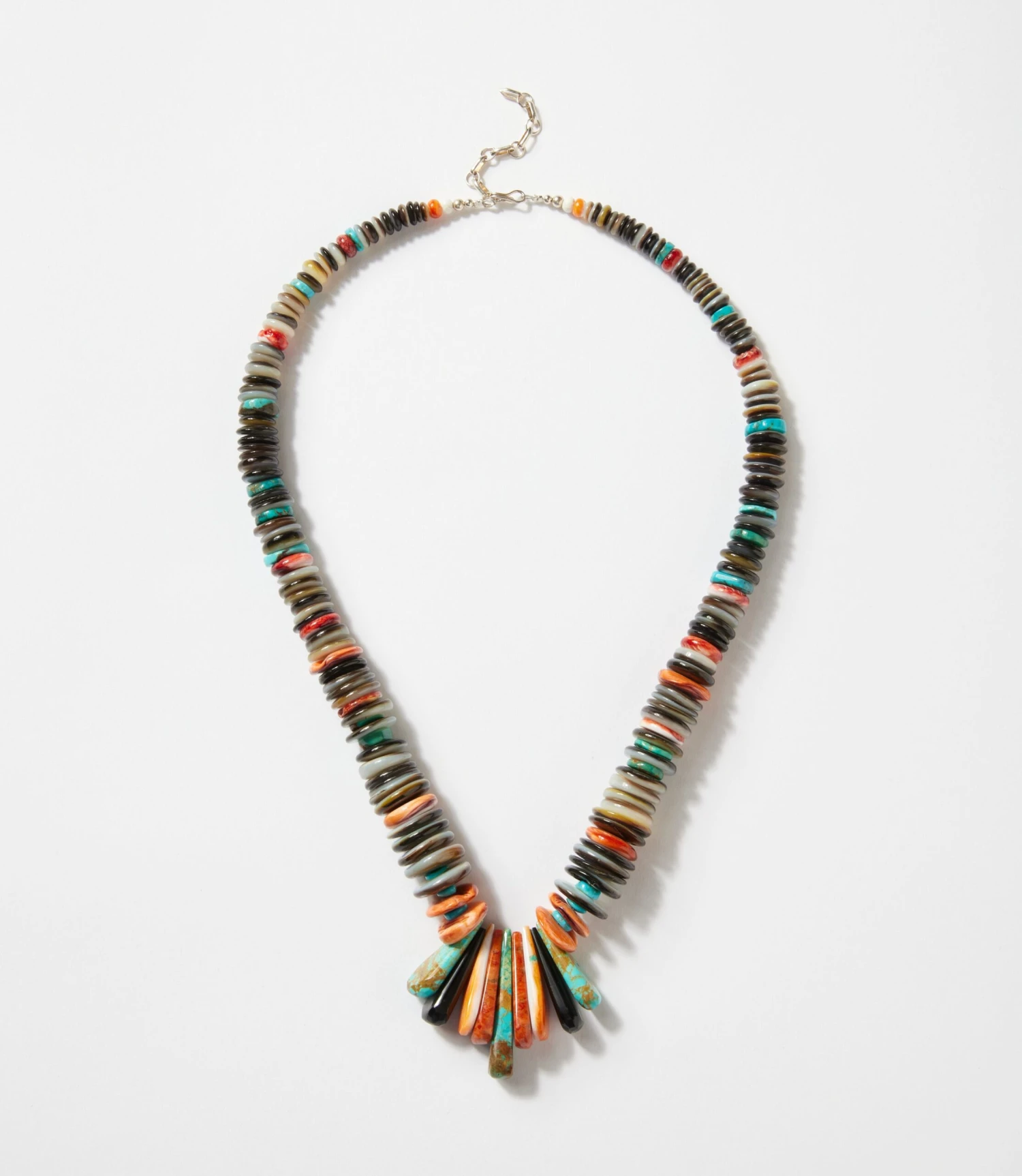 This Santo Domingo Multi-Color Turquoise Beaded Necklace features a vibrant arrangement of hand-shaped turquoise beads in a striking range of colors. The design is anchored by a dramatic row of elongated turquoise tabs at the center, adding dynamic movement and visual interest. Finished with a lobster clasp closure for a secure and comfortable fit.