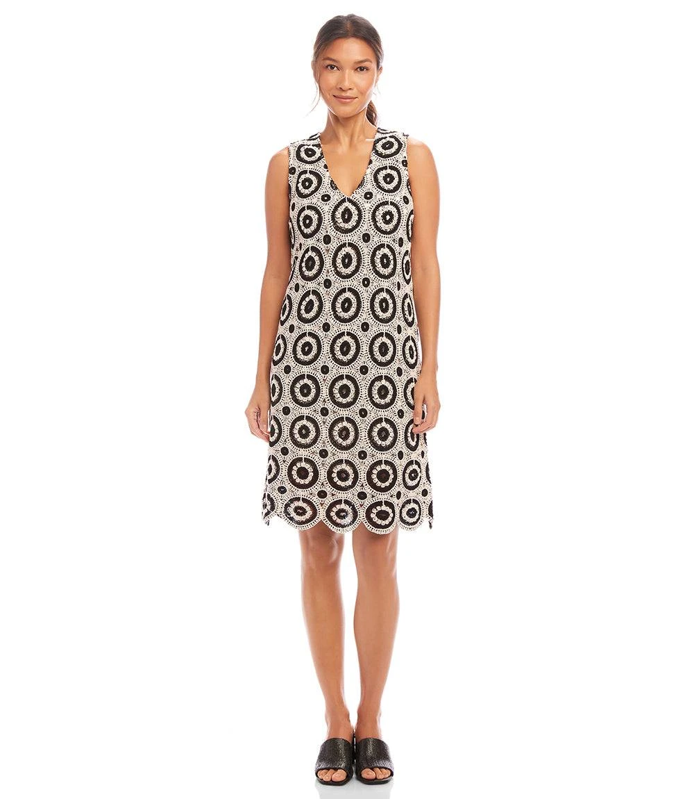 The dress features a shift silhouette and woven crochet circles, creating a textured and delicate design. The scalloped hem adds a touch of femininity. Perfect for any occasion, whether it’s a casual brunch or a night out. Embrace the spring season in this versatile and stylish dress.