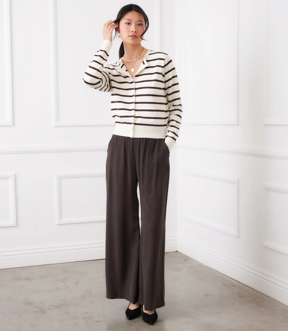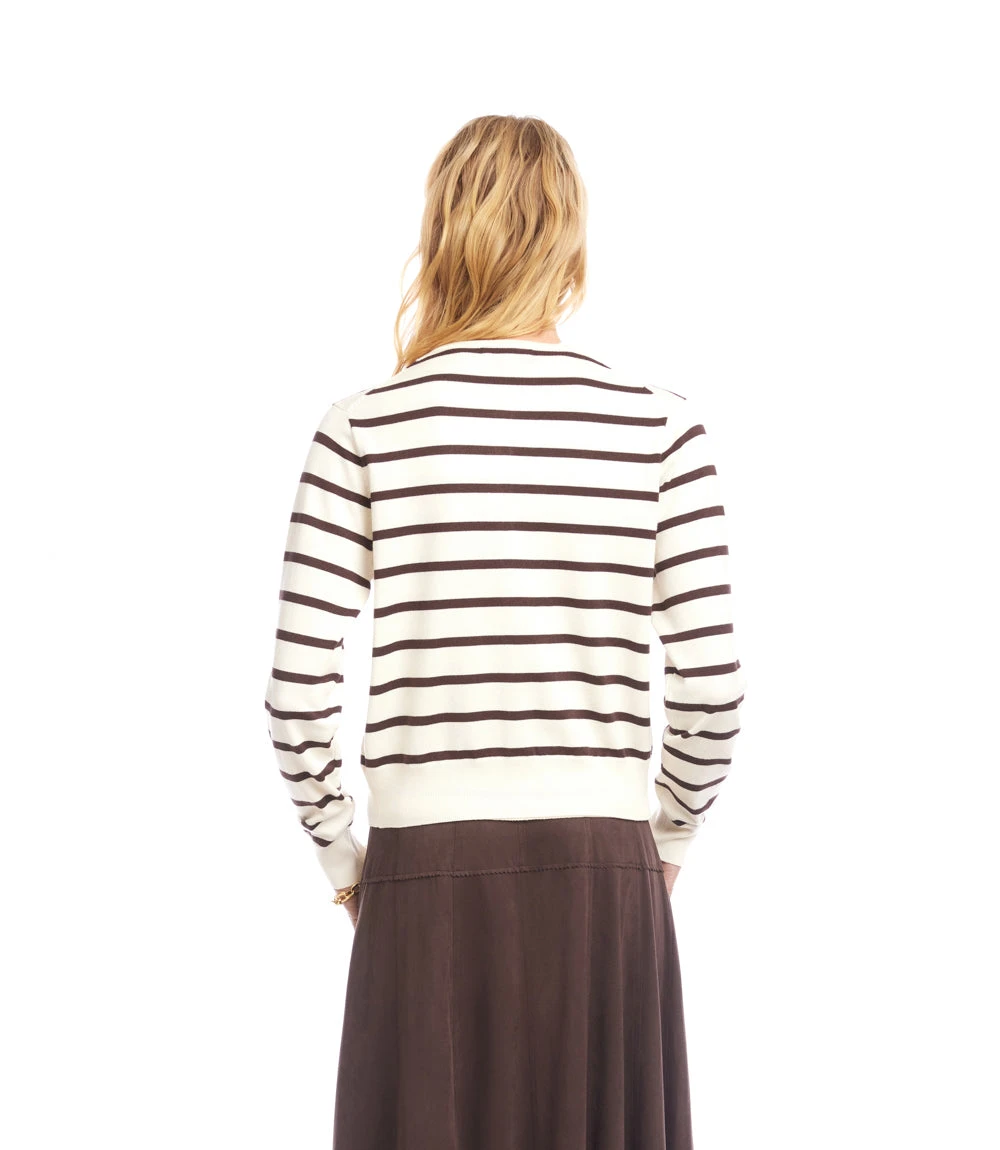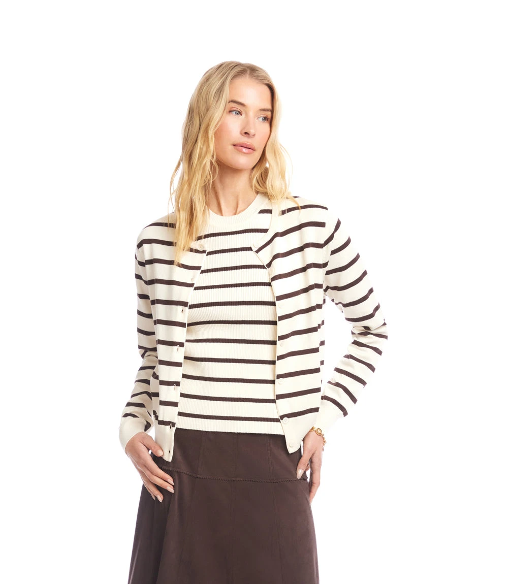 Featuring horizontal stripes, long sleeves, and a classic button-down front closure, it’s finished with ribbed edges for a clean, cozy look.