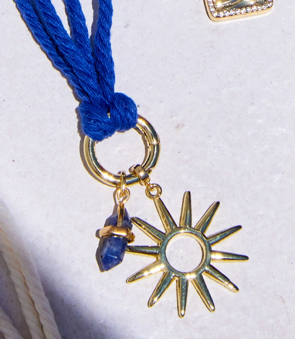 Brighten your look with this cobalt cotton cord necklace featuring a radiant sun charm paired with a deep blue sodalite point. Finished with gold plating, it adds a bold yet effortless touch of celestial energy. The adjustable cord closure allows for a customizable fit.