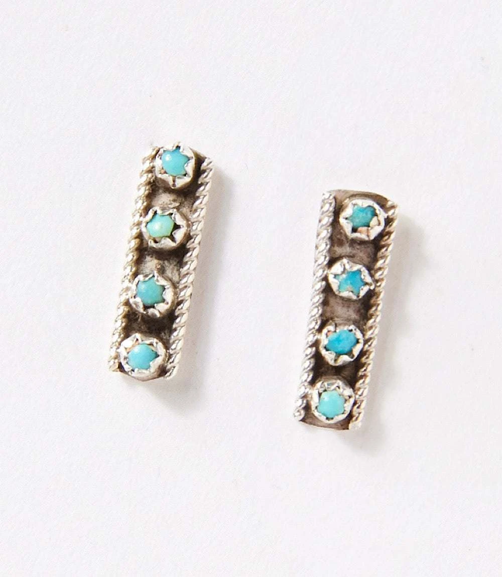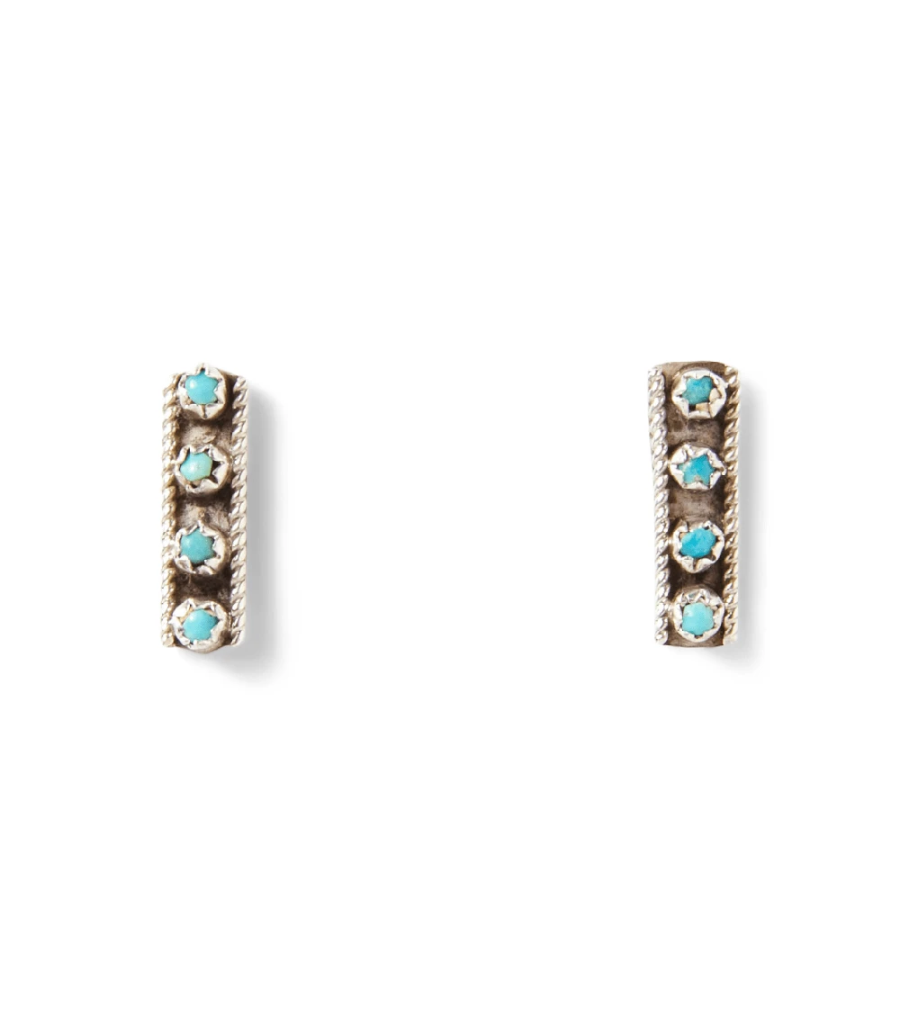 Handmade by a Navajo artist, these Bar Stud Earrings feature stunning Turquoise stones and are made with sterling silver. Each piece is uniquely crafted, making them one-of-a-kind accessories for any occasion. Elevate your style with these exquisite earrings.