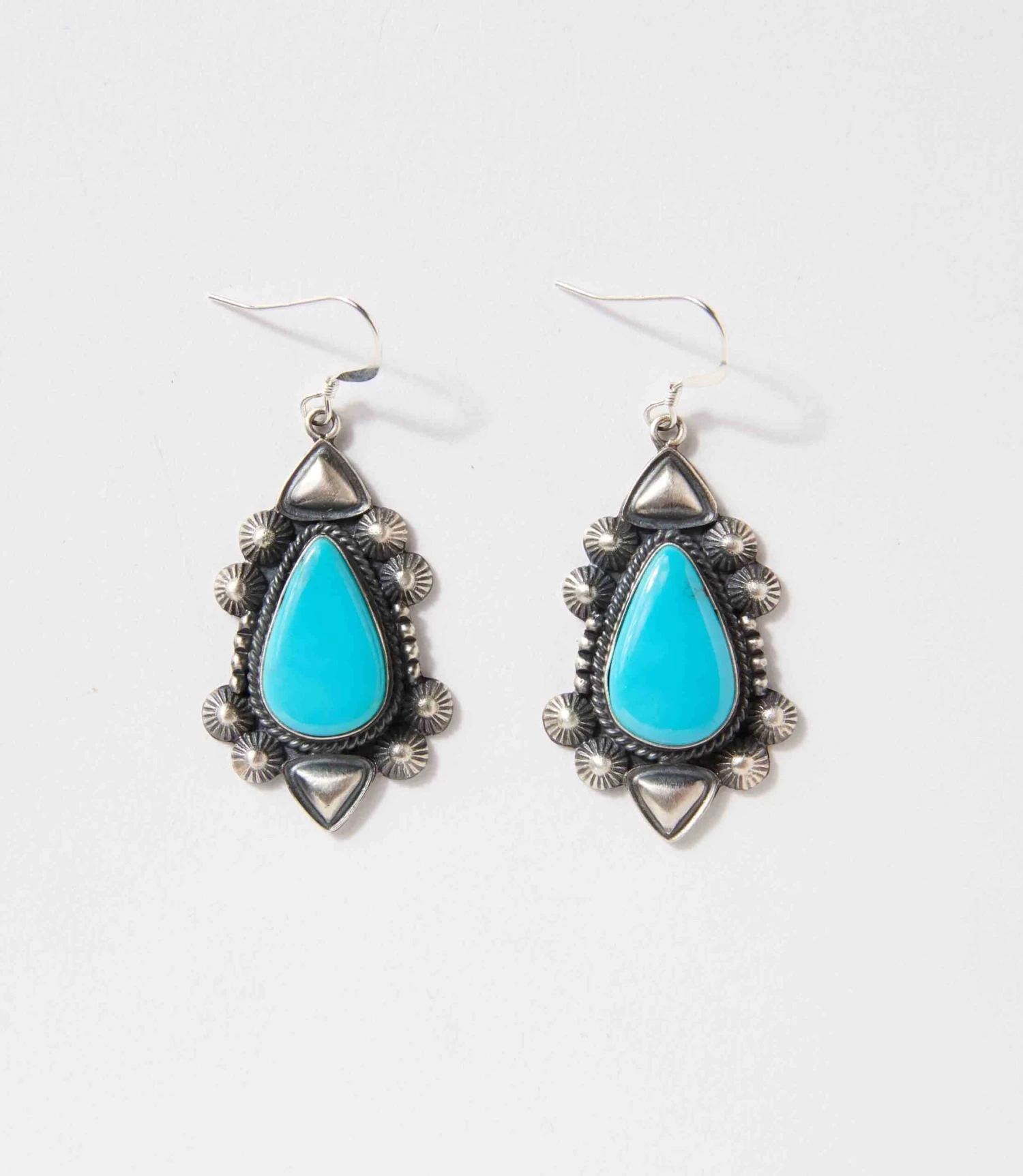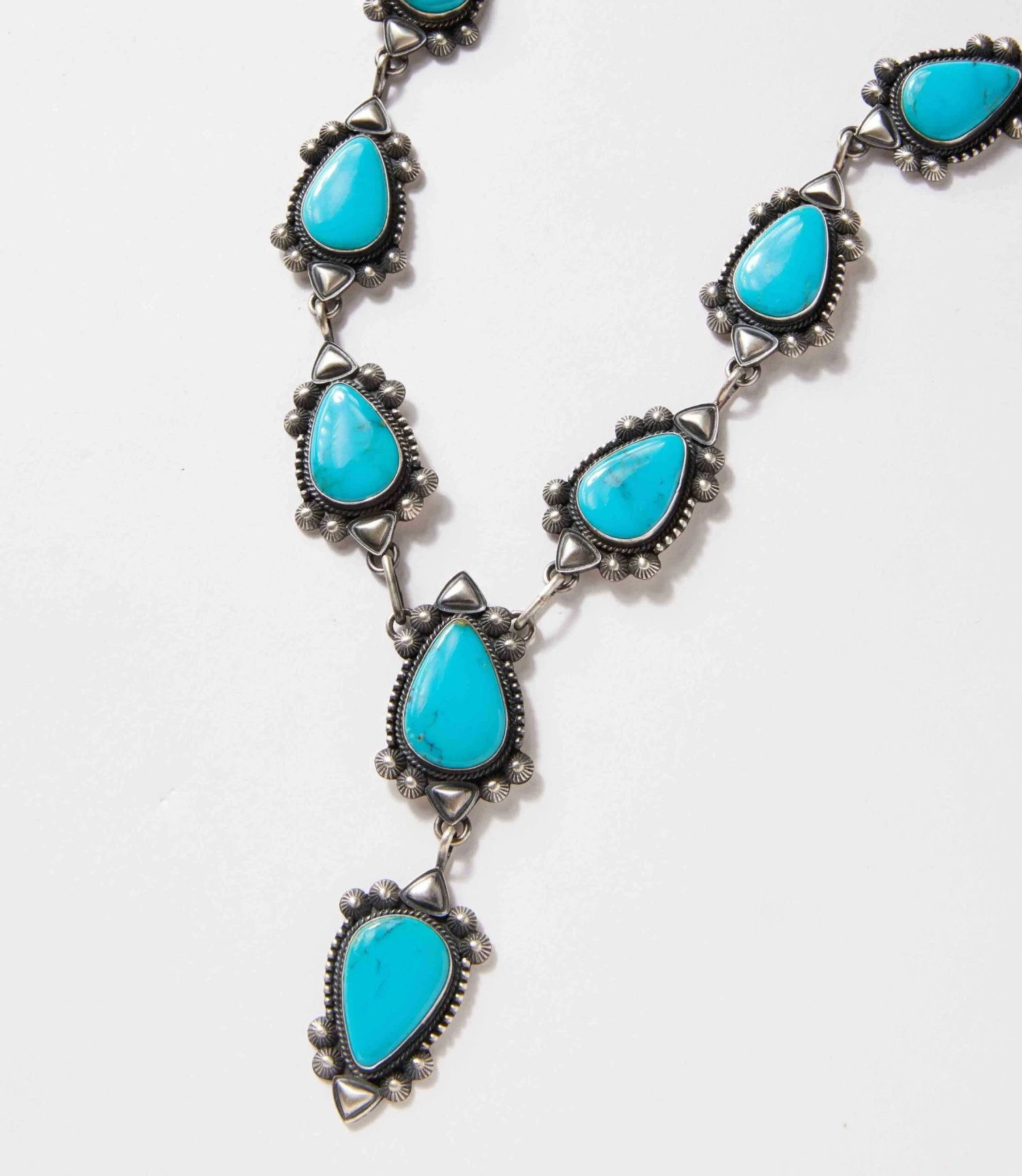 This stunning lariat necklace and earrings set features exquisite turquoise and sterling silver, skillfully handcrafted by a Navajo silversmith.