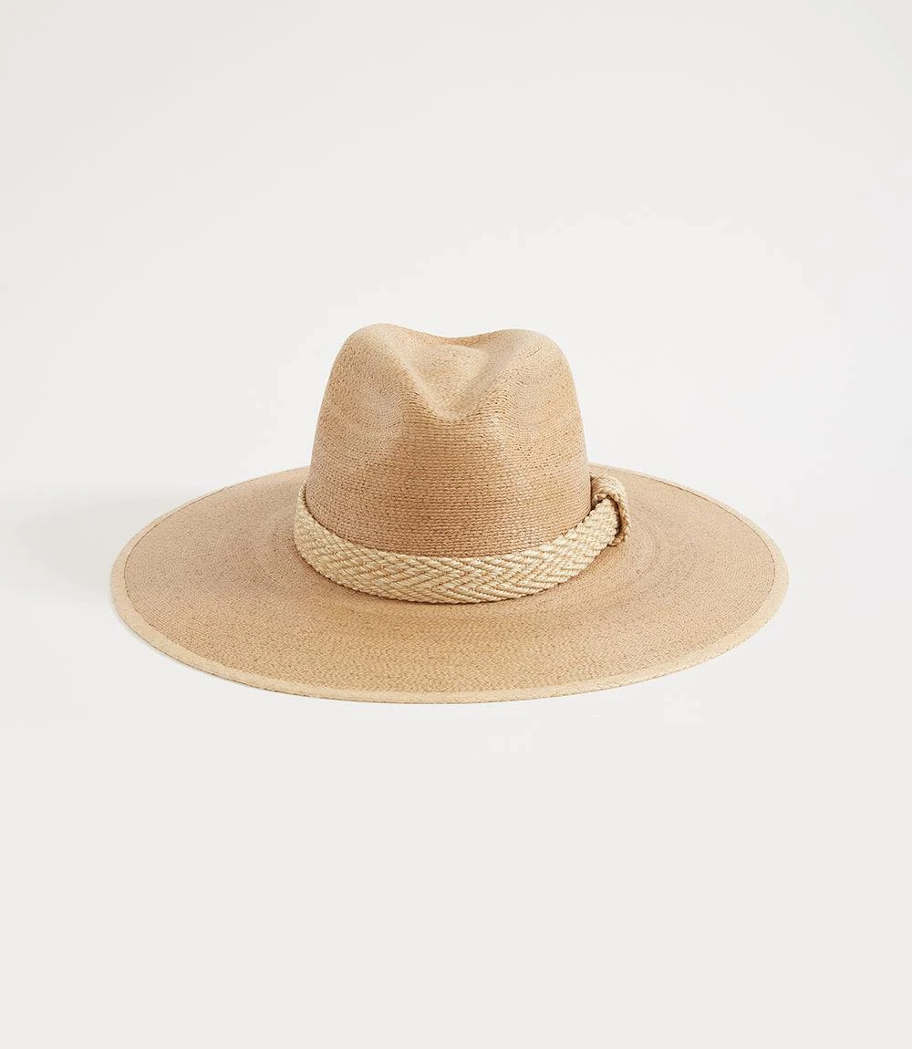 Complete your look with this wide-brimmed palm leaf hat detailed with a stylish braided band around the base of the crown.